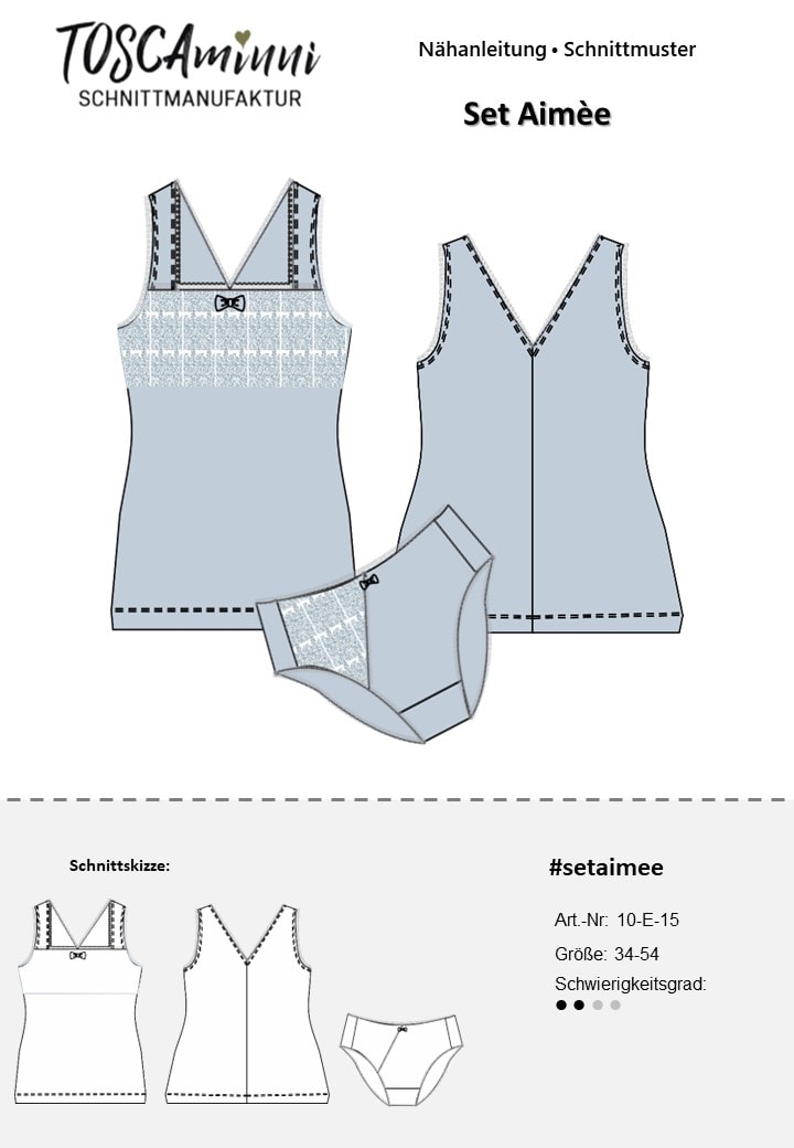 Entdecke das bezaubernde Schnittmuster Aimèe, ein romantisch gestaltetes Unterwäsche-Set bestehend aus einem Top und einem Slip. Das Highlight ist die exquisite Spitzenbordüre, die dem Schnitt eine elegante Note verleiht. Du kannst auch Spitzenreste wunderbar verwenden, um dem Set eine persönliche Note zu verleihen.