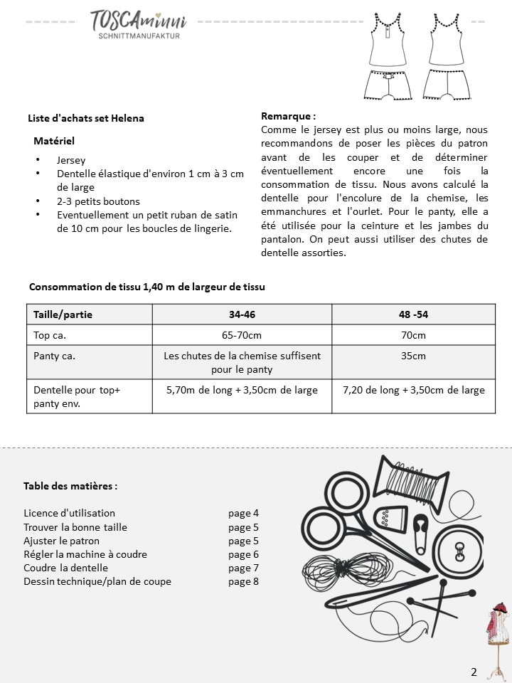 - Tissu conseillé : jersey, tissus bi-élastiques adaptés aux sous-vêtements + dentelle de linge / élastique de linge