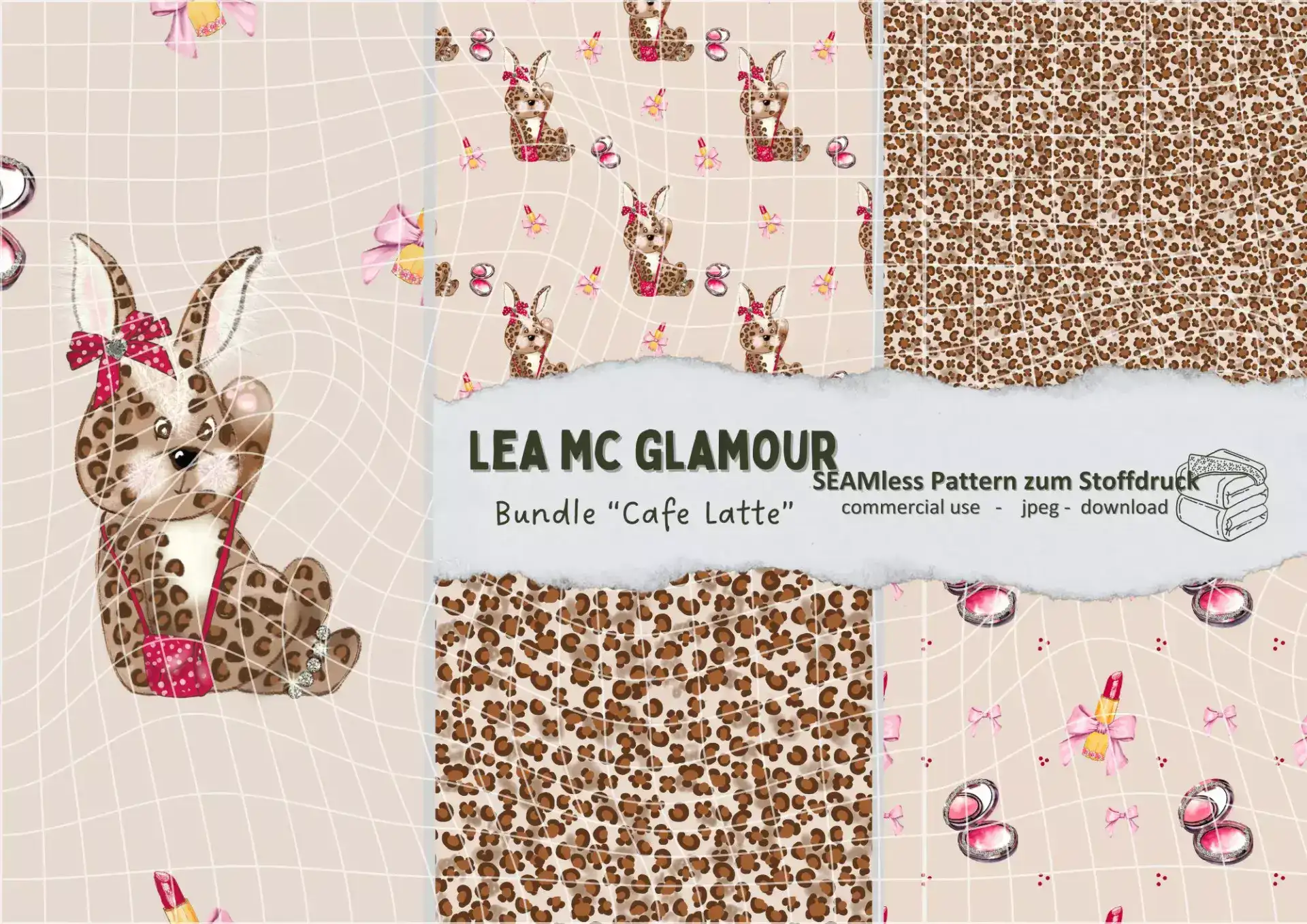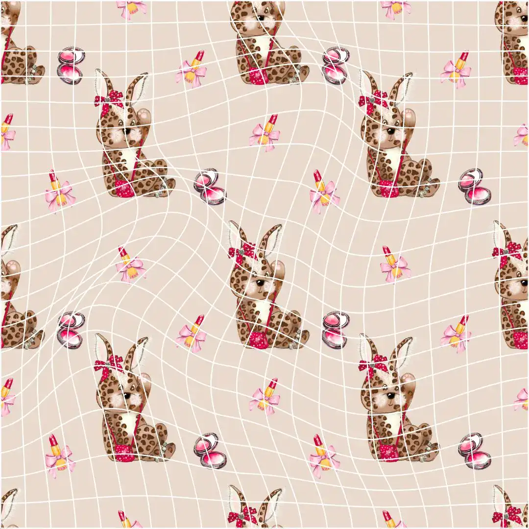 Entdecke unser entzückendes Endlos Muster mit dem hübschen Hasen „Lea Mc Glamour“ im Leopardenlook. Lea Mc Glamour liebt Make-Up und Glitzerschmuck. Seamless Pattern, speziell entwickelt für Textildruck.